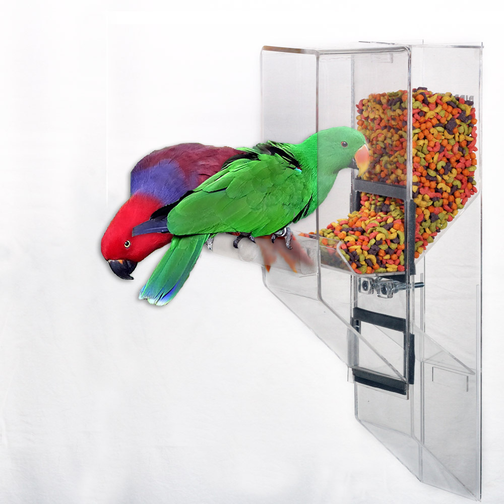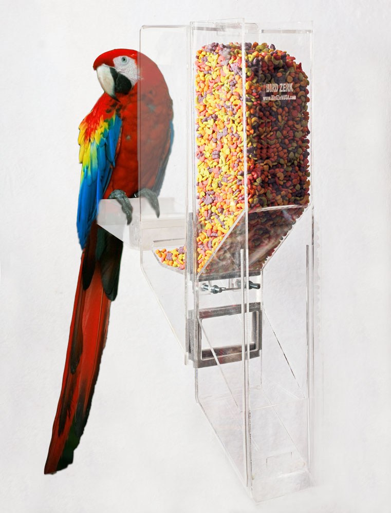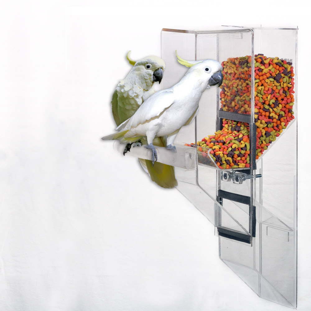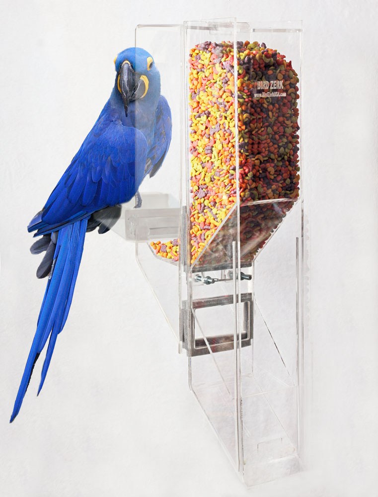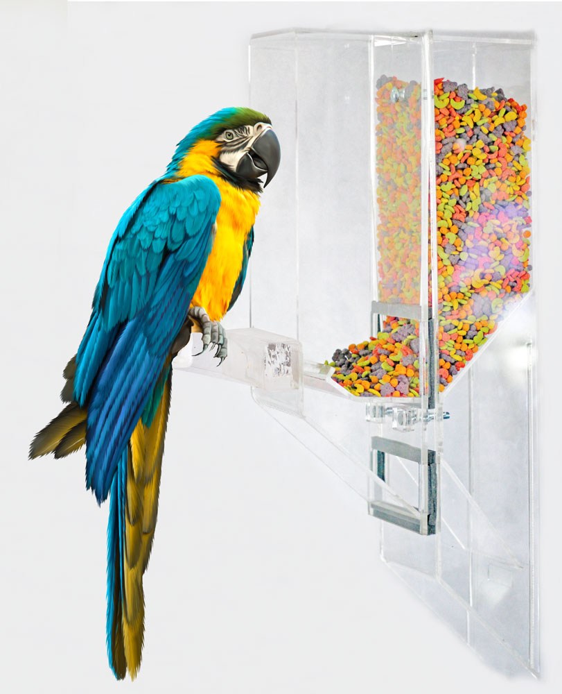 The Ex-Large is designed for the largest sized birds up to the Hyacinth Macaw, including Mollucan Cockatoo, Blue & Gold, Scarlet, and Green Wing, etc. The feeder works with a single bird, as well as breeders. ***Made of 1/4" thick acrylic.